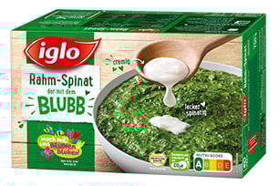 Der CO2e-Fußabdruck von 100 g iglo BLUBB-Rahm-Spinat, die in Deutschland konsumiert werden, beträgt